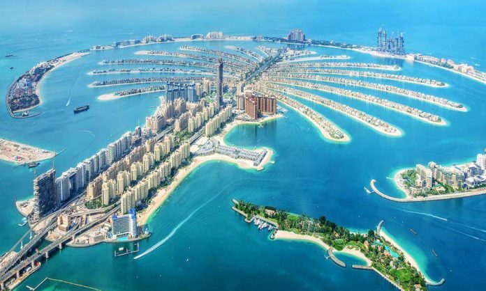 Палм-Джумейра та The View at The Palm: Штучний острів-пальма в Дубаї, на якому можна відвідати оглядовий майданчик для панорамного виду.