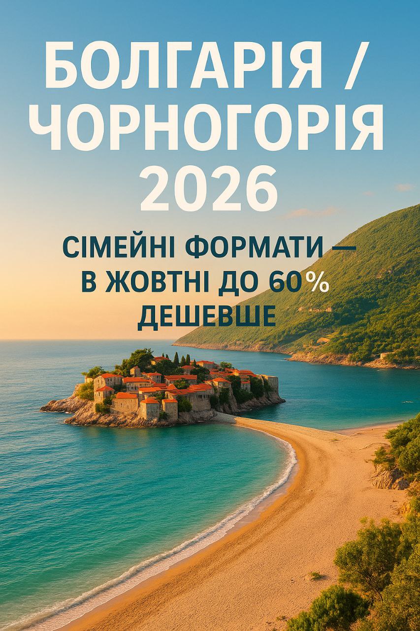Плануєте літню відпустку на морі з комфортом і без перевитрат? Осінь — саме час бронювати тури до Болгарії та Чорногорії на 2026 рік. У жовтні діють найвигідніші ціни — до 60%, а вибір сімейних готелів і форматів розваг зараз найширший.