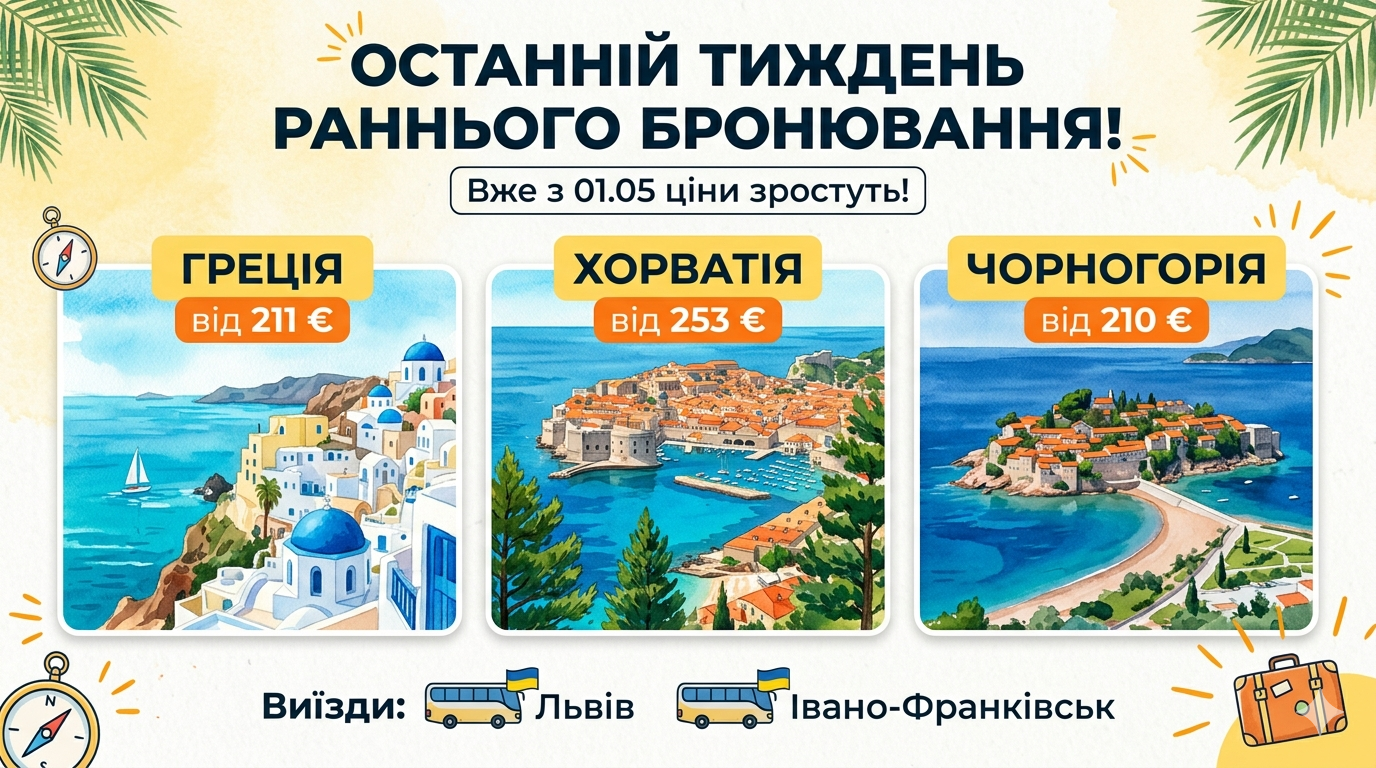 ГРЕЦІЯ, ХОРВАТІЯ, ЧОРНОГОРІЯ. ОСТАННІЙ ТИЖДЕНЬ РАННЬОГО БРОНЮВАННЯ!