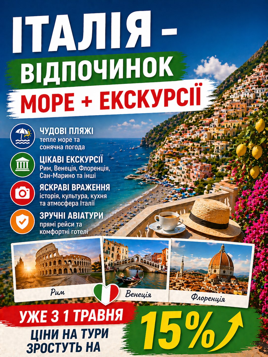 Бронюйте зараз, щоб відпочити в Італії яскраво і без переплат.