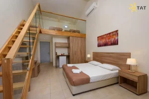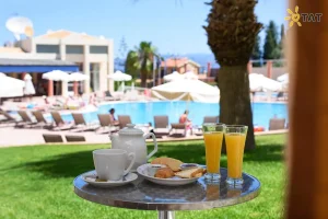 Готель має велику зелену територію, що нагадує невелике село — окремі будівлі, вимощені доріжки, пальми, оливкові дерева.