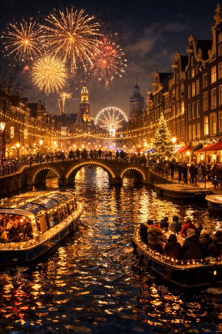 Амстердам на Новий рік — це особлива атмосфера свободи, світла та нескінченного руху. Місто каналів перетворюється на велику святкову сцену: ілюмінації над водою, жива музика на площах, бари та клуби, що працюють до ранку, і феєрверки, які відбиваються у темній воді каналів.