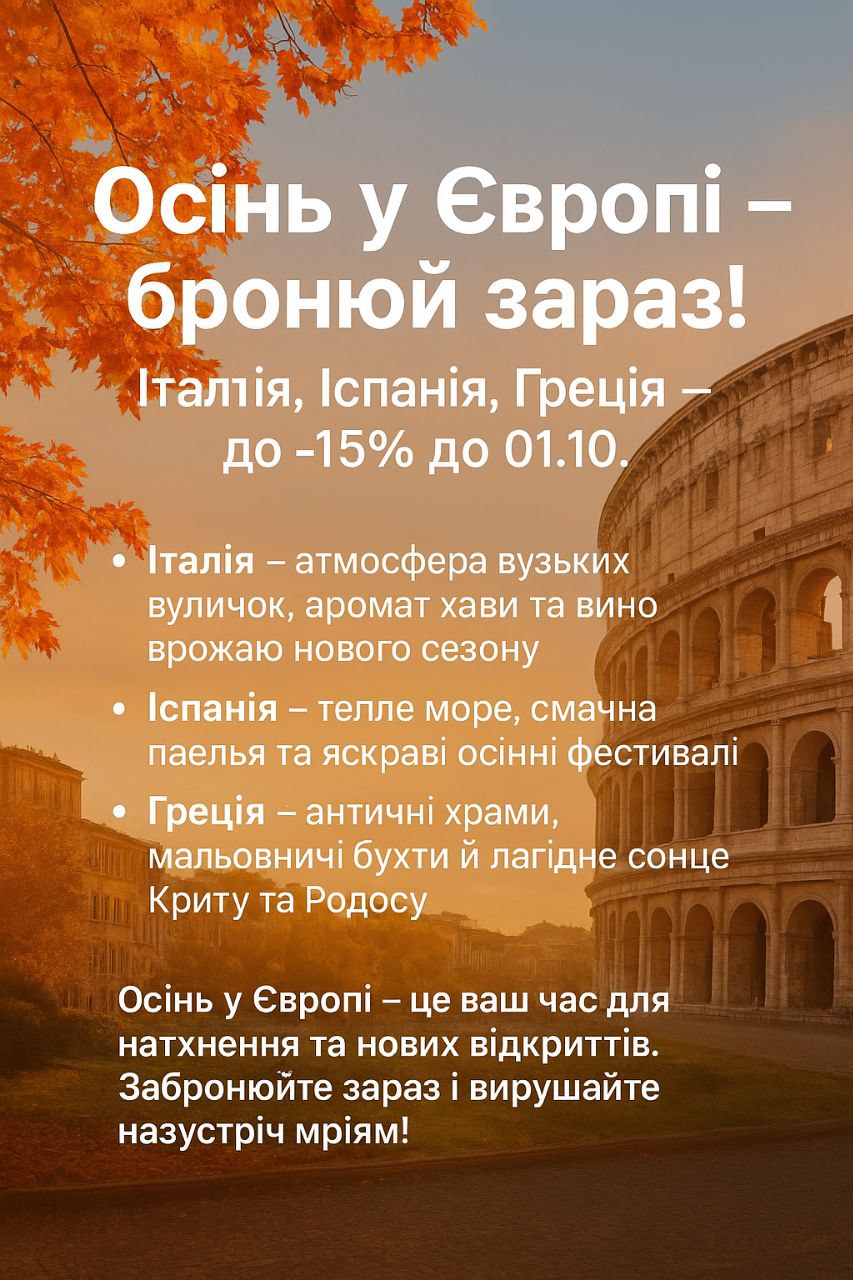 Плануєте втекти від осінньої буденності? Цього року Європа запрошує саме восени – м’якше сонце, менше туристів і приємніші ціни. До 1 жовтня діє спеціальна пропозиція: Італія, Іспанія, Греція – зі знижками до 15%.