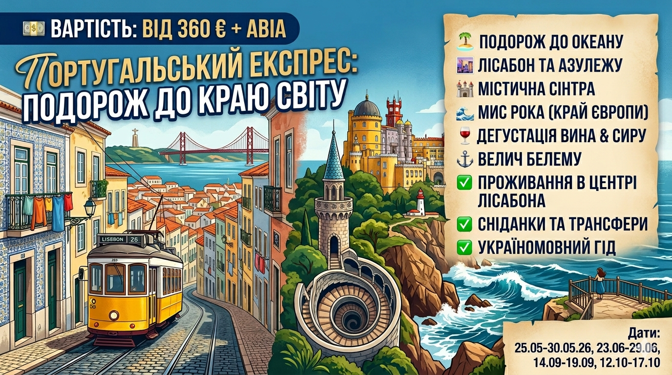 Відчуйте подих Атлантики та магію найзахіднішої країни Європи! Ми зібрали все найкраще: від старовинних вуличок Лісабона до містичних туманів Сінтри.