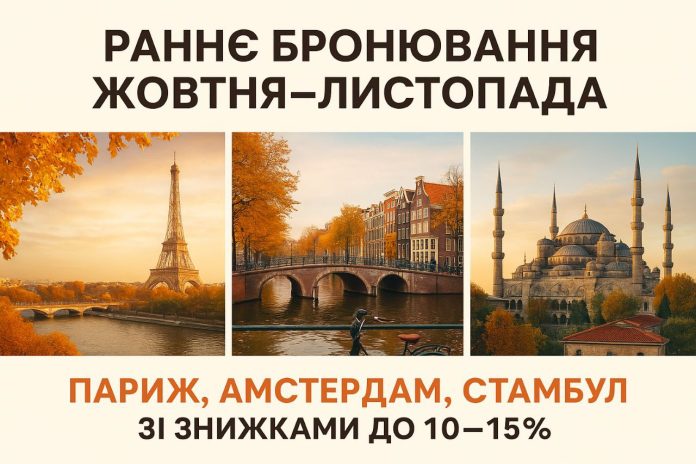 Раннє бронювання жовтня–листопада – Париж, Амстердам, Стамбул. До 10% вигідніше у вересні.