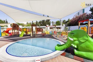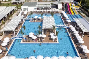 ✔️ Для відпочинку доступні два відкриті басейни, один критий басейн, аквапарк з гірками, приватний пляж із шезлонгами та пляжним волейболом.