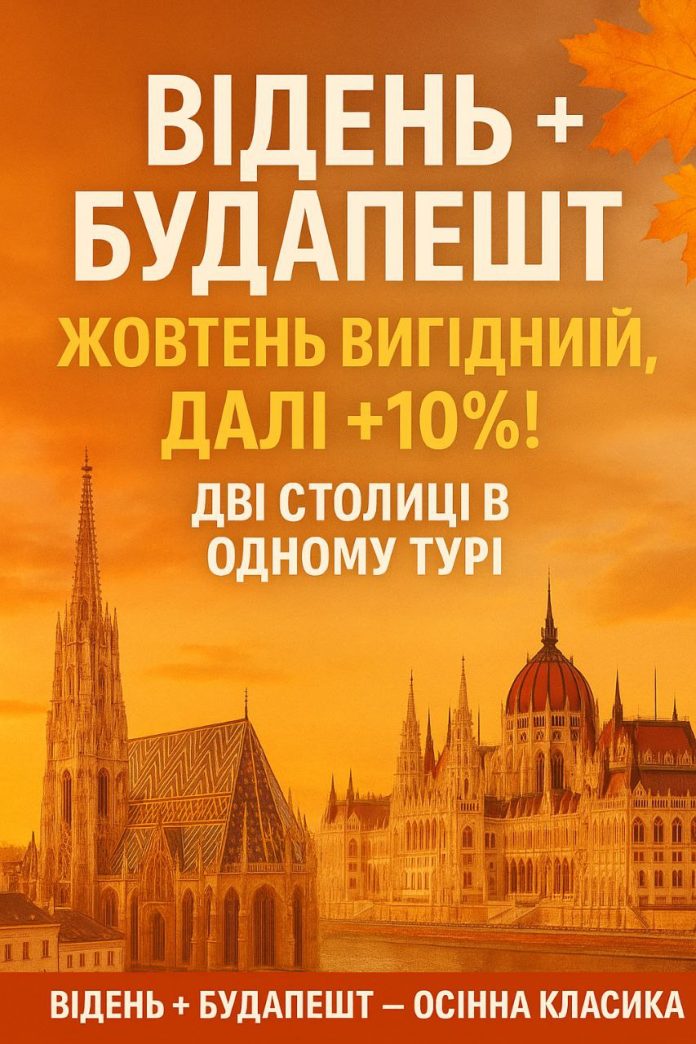 Осінь — найкраща пора, щоб вирушити в подорож до серця Європи. Тур «Відень + Будапешт» — це можливість побачити дві столиці, що колись належали одній імперії, але сьогодні зберігають свій неповторний шарм. І саме жовтень — час, коли ціни ще приємні, погода м’яка, а туристів менше, ніж у сезоні.