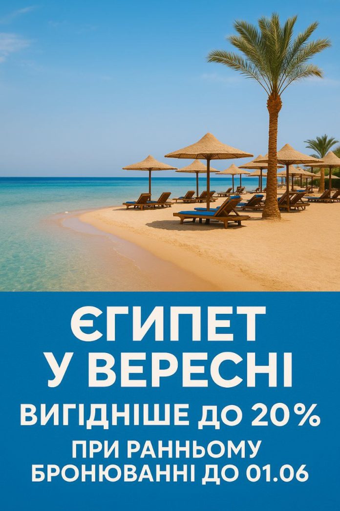 Відпочинок у Єгипті у вересні — це вигідно, комфортно та яскраво. А раннє бронювання до 1 червня дозволяє зекономити до 20% і обрати найкращі пропозиції сезону. Не відкладайте планування — вигідні тури розкуповуються швидко.