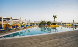 Дизайн готелю стилізований під комфортний лайнер, на даху якого знаходиться басейн. Більшість номерів готелю мають чудовий вид на затоку Наама Бей. Готель розташований на березі Червоного моря на плато Om El Sid Hill, за дві хвилини ходьби від центру Наама Бей